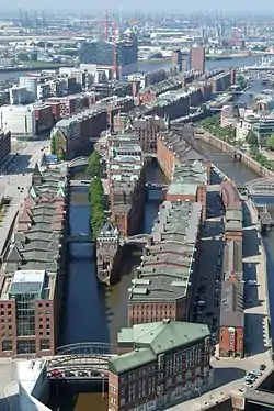 New bridges across the Elbe anabranches and the Elbe islands' canals were and are continued to be built to this day. Over the years, some of them have set new standards or records in engineering.[3] With the Elbe bridges being perceived as a symbol of the many changes associated with the Industrial Age, they were continuously subject to artistic and intellectual reception, among others by artists of the Hamburg Secession (Sezession) during the interwar period, or latest by the Internationale Bauausstellung during the 2000s. In 2015, the Speicherstadt was acknowledged as a World Heritage Site.