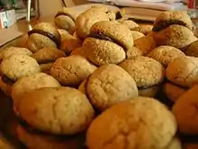 Italy (Sicily) | Moist, soft and chewy cookie that is of a light golden color, made from almond paste and studded with golden pine nuts (also called pignoli). (At the left in the picture.) |