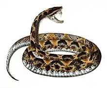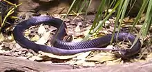 The Common death adder (Acanthophis antarcticus) is a highly venomous snake species with a 50–60% untreated mortality rate.[95] It is also the fastest striking venomous snake in the world.[96] A death adder can go from a strike position, to strike and envenoming their prey, and back to strike position again, in less than 0.15 seconds.[96] The SC LD50 value is 0.4 mg/kg[97] and the venom yield per bite can range anywhere from 70–236 mg.[98] Unlike other snakes that flee from approaching humans crashing through the undergrowth, common death adders are more likely to sit tight and risk being stepped on, making them more dangerous to the unwary bushwalker. They are said to be reluctant to bite unless actually touched.[99]
