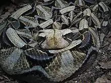 The Fer-de-lance or Terciopelo (Bothrops asper) has been described as excitable and unpredictable when disturbed. They can, and often will, move very quickly,[80] usually opting to flee from danger,[81] but can suddenly reverse direction to vigorously defend themselves.[72][81] Adult specimens, when cornered and fully alert, should be considered dangerous. In a review of bites from this species suffered by field biologists, Hardy (1994) referred to it as the "ultimate pit viper".[80] Venom yield (dry weight) averages 458 mg, with a maximum of 1530 mg (Bolaños, 1984)[19] and an LD50 in mice of 2.844 mg/kg IP.[81] This species is an important cause of snakebite within its range. It is considered the most dangerous snake in Costa Rica, responsible for 46% of all bites and 30% of all hospitalized cases; before 1947, the fatality rate was 7%, but this has since declined to almost 0% (Bolaños, 1984), mostly due to the Clodomiro Picado Research Institute, responsible for the production of antivenom. In the Colombian states of Antioquia and Chocó, it causes 50–70% of all snakebites, with a sequelae rate of 6% and a fatality rate of 5% (Otero et al., 1992). In the state of Lara, Venezuela, it is responsible for 78% of all envenomations and all snakebite fatalities. One of the reasons so many people are bitten is because of its association with human habitation and many bites occur indoors.