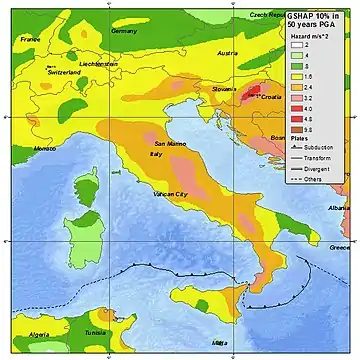 This is a list of earthquakes in Italy that had epicentres in Italy, or significantly affected the country. The highest seismicity hazard in Italy was concentrated in the central-southern part of the peninsula, along the Apennine ridge, in Calabria and Sicily and in some northern areas, like Friuli, part of Veneto and western Liguria.