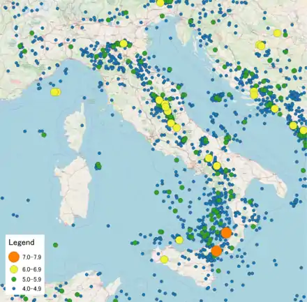 | 1456-12-05 | Molise | 7.1–7.4 Mw | X–XI | 30,000–70,000 | High intensity over large area. Largest earthquake on the Italian Peninsula. | [44] | |