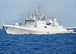 The Brahmaputra-class frigates (Type 16A or Project 16A) are guided-missile frigates of the Indian Navy, designed and built in India. They are an enhancement of the Godavari class, with the same displacement, 3850 tons, and length, 126 metres (413 ft), but with different configuration, armaments, and capabilities. Three ships of this class serve in the Indian Navy. The class and the ships, are named for Indian rivers.[45]