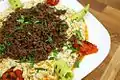 Minced meat cooked on sheesh and served with maydanoz and sauce, on top of special tire bread |