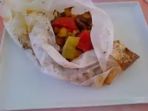 This is a list of kebab dishes from around the world. Kebabs are various cooked meat dishes, with their origins in Middle Eastern cuisine and the Muslim world. Although kebabs are often cooked on a skewer, many types of kebab are not.[1][2][3]