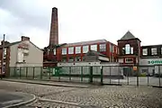Grade II listed building[7] Powered by a J&E Wood, 2000 ihp, horizontal cross compound, Corliss valves with superheated steam. Initially 4 Lancashire boilers fifth Yorkshire boiler added in 1918. The 24 ft flywheel was geared for 44 ropes. The chimney was 77 yds tall, later reduced to 60, when the mill was lengthened to 427 ft in 1918 it housed 127,400 mule and 12,600 ring spindles[2][8] |