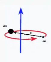 | Two point masses, m1 and m2, with reduced mass μ and separated by a distance x, about an axis passing through the center of mass of the system and perpendicular to the line joining the two particles. | ![]() |