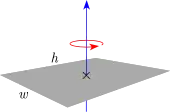 | Tilted solid cuboid of depth d, width w, and length l, and mass m, rotating about the vertical axis (axis y as seen in figure).