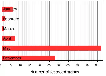 In the official Atlantic hurricane database, which dates back to 1851, the first storm to occur outside of the current season was in 1865 in the Caribbean Sea. In the database, 86 tropical or subtropical cyclones have existed between December and May, most recently Ana in 2021.[6][7] In addition, there were at least five storms in May and another in December before the start of the official database.[9]