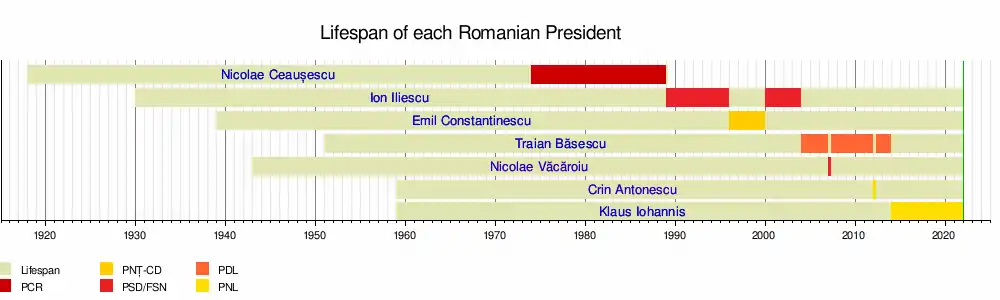 The President of Romania serves as the head of state of Romania. The office was created by the Communist leader Nicolae Ceaușescu in 1974 and has developed into its modern form after the Romanian Revolution and the adoption of the 1991 constitution. The current president of Romania is Klaus Iohannis, who has been serving since 21 December 2014.