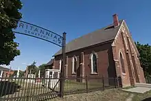 Britannia Road is named after the historic hamlet of Britannia, which was located at the intersection of Hurontario St, where its historic church and cemetery still stand. It continues east from Milton, and is designated as Peel Regional Road 3 as far as Hurontario St. It then continues to Kennedy Road, where it breaks due to the presence of the Highways 401, 403, and 410 stack interchange. It resumes west of Tomken Road and ends in the cargo terminal area inside Toronto Pearson International Airport. Originally extended to Indian Line (now mostly part of present-day Highway 427) but that section was cut off by the airport, though the easternmost portion still exists and is named Elmbank Drive, after the hamlet the airport displaced.