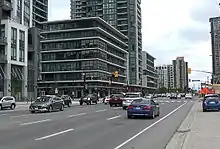 Confederation Parkway begins as a two-lane road at Queensway, widens to four lanes at Dundas St., and curves northwesterly towards Eglinton Ave. The section through the City Centre is rapidly developing into a condominium tower highrise node.