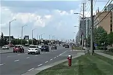 Matheson Boulevard is a mid-concession road built in modern times and follows a gradual diagonal course. It runs east from Terry Fox Way to Renforth Drive and has a brief 350 metre (0.2 mile) extension into Toronto via an overpass to meet Eglinton Ave.[4] It was originally an L-shaped side street centred around Dixie Road, east of which it turned south. It was later widened and extended in both directions, with the eastern section through the Airport Corporate Centre separated from the western section until it was bridged over the Etobicoke Creek. The extension resulted in the short north–south section being bypassed, though it was not renamed, and was itself extended south to meet Eglinton. However, this is technically not a name duplication, as the main section of the street has "East" and "West" designations, while the bypassed portion does not.