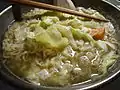 A Japanese noodle dish that consists of Chinese-style wheat noodles served in a meat- or (occasionally) fish-based broth, often flavored with soy sauce or miso, and uses toppings such as sliced pork, chāshū, dried seaweed, nori, kamaboko, green onions, and occasionally corn. |