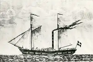 | 1830 | Frederik den Sjette | Jacob Holm, Christianshavn, Copenhagen | 150 | Ordered by the merchant Lauritz Nicolai Hvidt as replacement for the Caledonia. The first steamship built in Denmark - with the engine as a notable exception, being delivered from England. Chartered to the Royal Danish mail in 1844, for the route to Stettin. Sold in 1845 to the merchant A. Fibiger and employed on the service between Copenhagen and Flensburg. Ran aground in the autumn and was destoyed by a storm.[11] | ![]() |