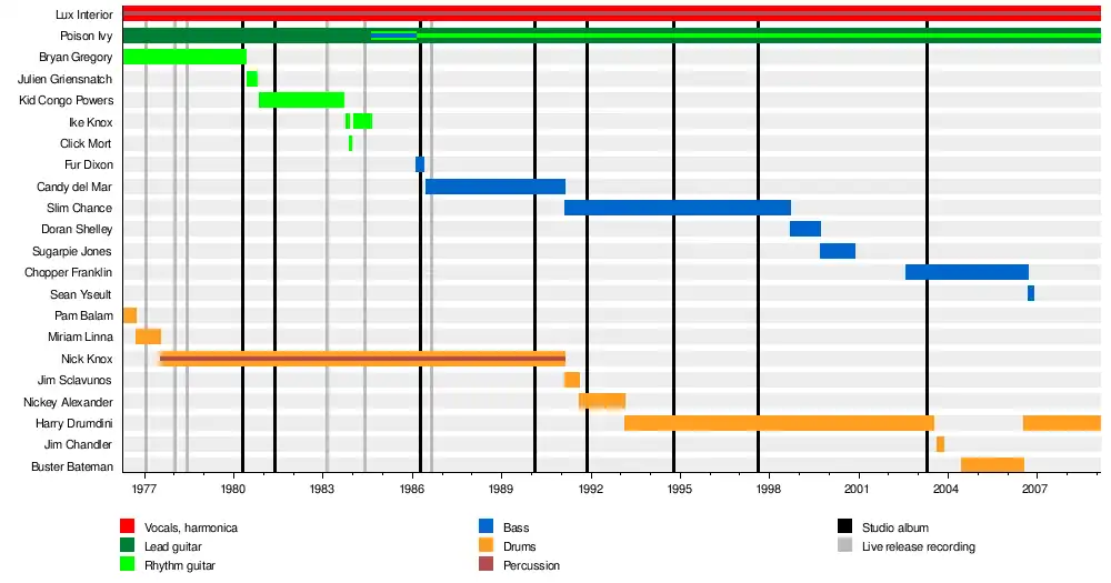Lux Interior, Poison Ivy, Bryan Gregory and Pam Balam (Gregory's sister) formed the Cramps in April 1976.[1] After just a few months, Balam was replaced by Miriam Linna.[2] She remained in the group until shortly after its first headlining show in July 1977, when Nick Knox (Nick Stephanoff) took her place.[3] After releasing three singles and a debut album, Songs the Lord Taught Us, Gregory left the Cramps at the end of May 1980 following a show in Berkeley, California.[4] He was briefly replaced during the summer of 1980 by Julien Griensnatch (Julien Hechtlinger),[5] before Kid Congo Powers (Brian Tristan) took over before the end of the year.[6]