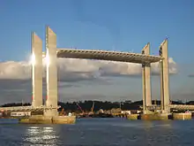 - Pont Gustave-Flaubert – crossing the Seine at Rouen, this lift bridge is the highest vertical-lift bridge in Europe, allowing ships up to 55 m tall to pass under it. It is 670 m long, with a span of 116 metres[3]. A striking design feature, the two road sections are mounted outside the central towers. The bridge was designed by François Gillard and Aymeric Zublena and opened to road traffic on 25 September 2008. It is named after the author Gustave Flaubert who was born in Rouen.[4]