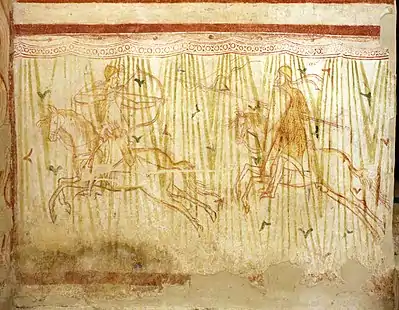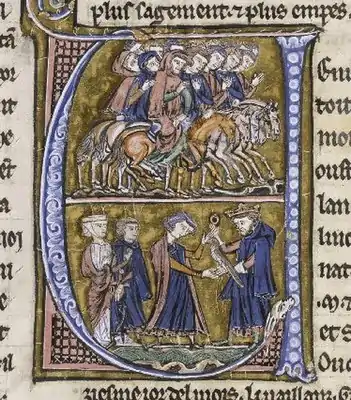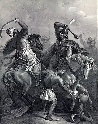 ![]() Saint Ladislaus is fighting a duel with a Cuman warrior (Chronicon Pictum, 1358) |