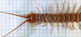 Lithobius forficatus, most commonly known as the brown centipede or stone centipede, is a common European centipede of the family Lithobiidae, although its distribution is not exclusive to Europe. It is between 18 and 30 mm long and up to 4 mm broad and is a chestnut brown color.