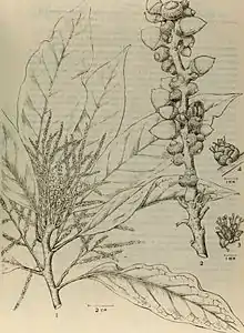 Lithocarpus elegans grows as a tree up to 30 metres (100 ft) tall with a trunk diameter of up to 70 cm (30 in). The greyish brown bark is fissured or lenticellate. The coriaceous leaves measure up to 17 cm (7 in) long. Its edible brown acorns are ovoid to roundish and measure up to 2.5 cm (1.0 in) across.[4]