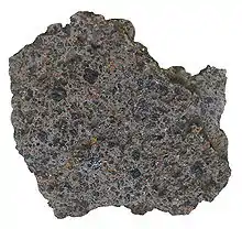 The texture of a rock describes the relationship between the individual grains or clasts that make up the rock. Sedimentary textures include the degree of sorting, grading, shape and roundness of the clasts.[22] Metamorphic textures include those referring to the timing of growth of large metamorphic minerals relative to a phase of deformation – before deformation porphyroclast – after deformation porphyroblast.[23] Igneous textures include such properties as grain shape, which varies from crystals with ideal crystal shapes (euhedral) to irregular crystals (anhedral), whether the rock shows highly nonuniform crystal sizes (is porphyritic), or whether grains are aligned (which is described as trachytic texture).[24]