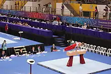 Tvorogalas on the pommel horse during the artistic gymnastics competition at the Bishan Sports Hall on 16 August 2010