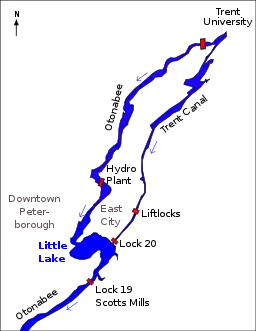 Little Lake is a small lake on the Otonabee River in the city of Peterborough, Ontario, Canada. The lake is in the downtown of the city and is used for fishing, swimming, boating, and for various special events. The lake lies on the water route from Lake Ontario to the Kawartha Lakes. The area around the lake was first settled by Europeans around the start of the 19th century. Steam- and water-powered saw mills were built on the lake and on the river upstream to prepare lumber for shipment overseas. Sawdust and other debris from the mills polluted the lake, killed the fish and clogged up the navigable channels. The smell was so noxious it drove residents near the lake to move. These problems were resolved by the end of the century, when the lake became a hub on the new Trent-Severn Waterway from Lake Ontario to Lake Huron. However, industries attracted by cheap hydroelectric power, such as General Electric used the lake for disposal of industrial chemicals for many years. The pollutants seems to be mostly contained in the sediment, and the lake is now considered safe for recreational use.