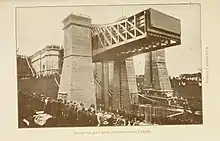 In the 1820s, before a dam had been erected at the locks below Little Lake, the Otonabee was shallow and could easily be forded on foot opposite the old steamboat landing beside the Shaw & Fortune steam mill.[14] In 1833 and 1835 L.H. Baird made a survey of the route of what would become the Trent–Severn Waterway connecting Lake Huron to Lake Ontario, and following his recommendation locks were built at Bobcaygeon, Little Lake, Hastings and Chisholm Rapids.[15] Work began on a dam and lock at Whitla's Rapids in 1837, now Scott's Mills lock, where a 3 feet (0.91 m) drop in the river prevented steamers from reaching Little Lake, but proceeded slowly.[16] Construction lasted from 1837 to 1844.[17] Three piers and a boom were completed in 1852 by Public Works Canada.[18]