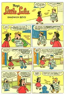 Little Lulu is a comic strip created in 1935 by American author Marjorie Henderson Buell.[1] The character, Lulu Moppet, debuted in The Saturday Evening Post on February 23, 1935, in a single panel, appearing as a flower girl at a wedding and mischievously strewing the aisle with banana peels. Little Lulu replaced Carl Anderson's Henry, which had been picked up for distribution by King Features Syndicate. The Little Lulu panel continued to run weekly in The Saturday Evening Post until December 30, 1944.