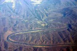 ![]() Oblique air photo of the meandering Potomac River at Little Orleans (center), facing north. The photo shows Allegany County, Maryland (left), Morgan County, West Virginia (right), Sideling Hill (right), and the Chesapeake and Ohio Canal. | |
