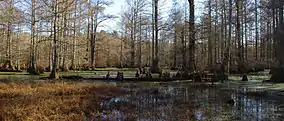 The refuge contains most of the remaining bottomland hardwood communities in the southeastern part of the state. It is characterized by low, wet oak and hickory forest with oxbows and sloughs. Trees of the landscape include hickory, willow oak, sweetgum, cypress, white oak, loblolly pine, and walnut.