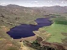 The earthen dam was originally constructed from 1936 to 1939 by the United States Bureau of Reclamation as a flood control and irrigation storage project, then modified in 1960. The dam impounds the Little Wood River, is 129 feet (39 m) tall, and is 3,100 feet (940 m) long at its crest.[2] The 1960 modification included the installation of a one-unit hydroelectric power plant that generates three megawatts. The dam is owned by the Bureau and is operated by the local Little Wood River Irrigation District.[3] </ref> The reservoir it creates, Little Wood River Reservoir, has a maximum capacity of 30,000 acre-feet (37,000,000 m3) and about 9 miles (14 km) of shoreline.[4] Recreation includes fishing (for rainbow, cutthroat, and brook trout), hunting, boating, camping and hiking.[5]