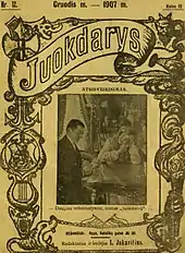 But now, the most important historians and museologists of Lithuania like Almantas Šlivinskas, Leopoldas Rozga or Leonas Peleckis-Kaktavičius, consider him one of the most important writers and publishers of Lithuania. He produced more than two million books and performed more than 280 plays in 1898–1938.[1] From 1888 to 1891 he worked in Šiauliai (Lithuania) as a journalist and writer. In 1891, he settled in Riga (Latvia), where he started working as judge and administrator of the railway company. In 1904, he opened his own printing house (AB Lietuvos Knygynas) and his own bookstore in Riga (Latvia). In 1909, he founded the newspaper Rygos naujienos which maintained its activities until 1915.[2] He also collaborated with other newspapers and journalists like his friend Antanas Smetona (writer, journalist and the first president of the Republic of Lithuania). It should be mentioned that Antanas Smetona wrote about Liudvikas Jakavičius in his memories, written in Cleveland, Ohio, US, in 1960.[3] In 1910, Jakavičius founded The Society of Lithuanian Theatre of Riga. In 1914, he financed the construction of the Lithuanian Theater of Riga. That same year he founded the Lithuanian–Latvian Savings Bank. His bank grew up rapidly, but it was expropriated in 1915 by the State Bank of the Russian Empire, as a result of the beginning of the First World War. In 1916, all his business was paralyzed and confiscated by the outbreak of the First World War and he changed his residence to Saint Petersburg (Russia). He bought 15,000 USD (equivalent to US$350,000 in 2014) in printing equipment and moved the machinery in secret to Saint Petersburg, where he continued with his printing house spreading Lithuanian language.