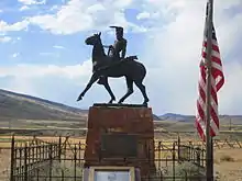 Johnson joined Company H, 2nd Colorado Cavalry, of the Union Army in St. Louis in 1864 as a private and was honorably discharged the following year.[8] During the 1880s, he was appointed deputy sheriff in Coulson, Montana, and a town marshal in Red Lodge, Montana. In his time, he was a sailor, scout, soldier, gold seeker, hunter, trapper, woodhawk, whiskey peddler, guide, deputy, constable, and log cabin builder, taking advantage of any source of income-producing labor he could find. His final residence was in a veterans’ home in Santa Monica, California, where he died on January 21, 1900. His body was buried in a Los Angeles veterans' cemetery. However, in 1974, after a six-month campaign led by 25 seventh-grade students and their teacher, Johnson's remains were relocated to Cody, Wyoming.[9] His epitaph reads "No More Trails"