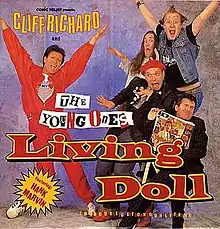 In 1986, 27 years after the first release, alternative comedy group The Young Ones approached Richard to record a comic version of "Living Doll" for the Comic Relief charity. Despite the apparent contrast between the anarchic comedians and the clean cut Richard, he agreed and their version again topped the UK Singles Chart, for three weeks from March 1986.[14][15] The single was certified gold in the UK by the BPI in April 1986.[16] Shadows guitarist Hank Marvin was reunited with Richard on this recording for the first time since 1975.