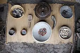 The 1700 Ioway Indian Farm features the farming techniques of the Ioway Indians. Archaeologist Mildred Mott Wedel was consulted for the design of this project.[3] The farm includes produce originating from the 1700s including blue corn and Omaha melons. Interpreters inform visitors about the Ioway lifestyle including topics such as hunting, roles of men and women, and tool making. Demonstrations include tanning hide, food preparation, and making traditional pottery.