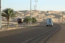 Liwa Oasis is about 97.6 km (60.6 mi) south of the Persian Gulf coast and 150 km (93 mi) southwest of the city of Abu Dhabi, on the northern edge of Rub' al Khali desert. It is centered around 23°08′N 53°46′E and stretches about 100 km (62 mi) east-west, along an arch curved to the north. It consists of some 50 villages. The geographic and economic center of the oasis is Muzayri`, where the highway from Abu Dhabi enters the oasis and then divides to the east (65 km (40 mi) to the easternmost village, Mahdar Bin `Usayyan) and west (45 km (28 mi) to the westernmost village, `Aradah). According to the census of population of 2005, the population was 20,196.[2] Earlier estimates judging from satellite images which gauged the population at 50,000 to 150,000, were too high.[3] The villages of Liwa Oasis are the southernmost settlements of Abu Dhabi and of the United Arab Emirates. The southern border of Abu Dhabi with Saudi Arabia, which runs at a distance between 16 and 35 km (9.9 and 21.7 mi) to the Oasis, is a straight line in the Rub al Khali desert, which is largely uninhabited. Mahdar Bin `Usayyan is the southernmost village of the Emirates, and also the easternmost of the oasis. 10 km (6.2 mi) south of the border, and 40 km (25 mi) south of the eastern part of the oasis is the Saudi oil facility Shaybah. However, there is no road linking Liwa Oasis and Shaybah, and no border crossing. A modern, multi-lane highway connects the oasis area to the capital, Abu Dhabi.
