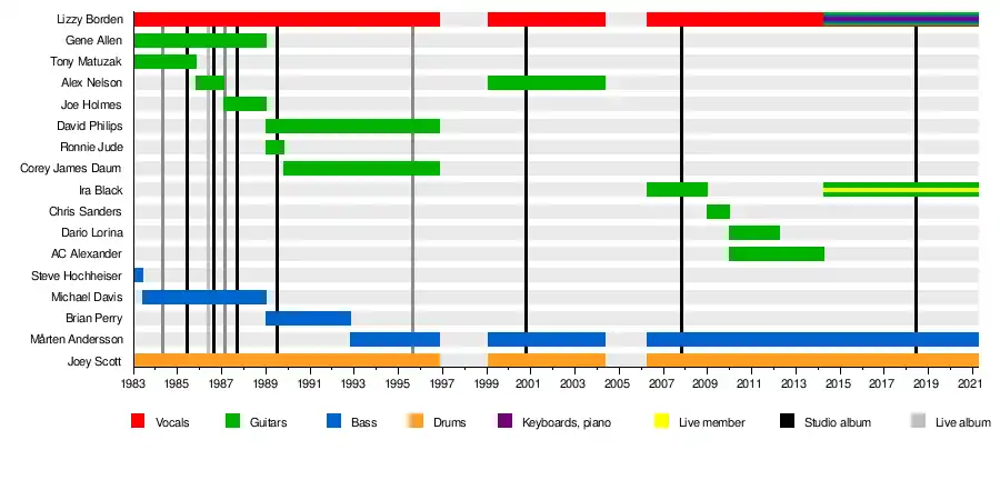 Lizzy Borden is an American heavy metal band formed in Los Angeles in 1983. To date, the band has charted on the Billboard 200 four times.[1] Lizzy Borden is eponymous of the band's lead vocalist.