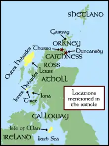 The saga relates how in Orkney, Sveinn murdered one of the earl's followers, and immediately fled to the Bishop of Orkney. The bishop protected Sveinn by sending him away to the Suðreyjar, into the care of Holdboði Hundason, a chieftain on the Inner Hebridean island of Tiree.[24] Later, in early spring,[note 4] the saga relates how Sveinn travelled to Atholl, where he stayed for a long period of time. From Atholl, Sveinn made his way back towards Orkney by land, and on the journey northwards, he passed through Thurso, in Caithness. The saga notes that Sveinn was accompanied by Ljótólfr, and that Sveinn had spent much of the previous spring with Ljótólfr.[25] The chieftain who lived at Thurso was an earl named Óttarr, who is described as "a man worthy of honour".[23] Earl Óttarr was a brother of Frakökk, and the saga relates how Ljótólfr negotiated a truce between Sveinn and Earl Óttarr, after Sveinn's father was killed by Ölvir.[25]