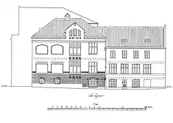 The hospital opened on January 1, 1869, and looked like a slightly larger dwelling house.[1][3][4] The reason for this is said to have been that no experts were consulted during the construction. It was made of wood, and had two floors and a basement. The basement contained a food cellar, bathroom, autopsy room, and morgue. The ground floor contained a kitchen and a doctor's residence with five rooms. The upper floor had five sickrooms and 27 beds. The attic had four garrets for venereal patients.[3]