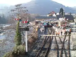 Llangollen railway station in the town of Llangollen, Denbighshire, Wales, is a preserved railway station on the former Ruabon to Barmouth Line, and now the eastern terminus of the preserved Llangollen Railway.