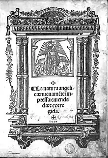 Furthermore, one of the French incunable editions was the first printed book in the Swiss city of Geneva.[1] We could say that this matter should have been treated in Eiximenis' Huitè (eighth volume) of his encyclopedic project Lo Crestià. This book should have dealt with the order of things and creatures according to medieval mentality. This order appears in what he calls "strata", and he considers that angels are one of these strata, according to the theological Medieval mentality. It appears in the famous Peter Lombard's Four Books of Sentences Quattuor libri sententiarum. The second book deals with angels. Eiximenis confirms that in the 43rd chapter of his Segon del Crestià (Second volume of Lo Crestià).[2]