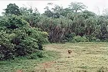 Lobéké National Park belongs to the Moloundou arrondissement, located in the vicinity of Boumba-et-Ngoko. The Moloundou area has been described as "one of the richest rubber areas of Africa" and the Germans established a rubber making plant in the area.[7] The park is located close to the borders with neighbouring Republic of Congo and Central African Republic, which is why the tri-national environmental initiative with the park and Dzanga-Sangha Forest Reserve and the Nouabalé-Ndoki National Park was made. The park covers 1,838.55 km2 (709.87 sq mi),[8] and its altitude ranges from 300 m (980 ft) to 750 m (2,460 ft) above sea level.[2] More than twelve natural savannas, characterized as saline swamps, occur within the park. There are also sandbars on the Sangha.[2] The annual rainfall averages 1400 mm., with the dry season occurring from December through February.[1] Large forest clearings, or bais, have soils rich in various minerals that attract the mega fauna of the forest. Lobéké is the home of many different ethnic groups including the Baka, the Bantu and the Bangando.