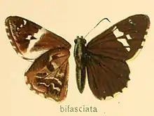 L. bifasciata Brem. (84 b). Wings dull greyish black. The forewing with a transparent white band composed of five spots, which are separated by the veins; it ends before vein 1. The underside of the forewing is greyish lilac before the three apical spots. The hindwing beneath bears three but little prominent bands, the outer margin being dusted with lilac grey before the fringes. The species occurs throughout northern Asia with the exception of the high north: Korea, Amur, northern China.[2]