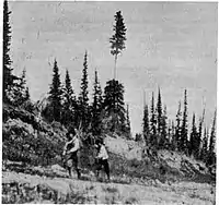 The lobstick was created by cutting off most of the lower branches of tall pine or spruce trees. The remaining tuft on the top would make the tree conspicuous from a distance. Occasionally other trees surrounding the lobstick would be cut down to further improve its visibility. In some instances, the bark was removed and names were carved on the wood. The usages could be both practical and symbolic. Lobsticks would mark trails or portages, sources of food, or hunting grounds. They were also used as cultural markers, to signify meeting places, burial grounds, ceremonial sites, personal totems or to honour someone. Lobsticks could also be known as "lopsticks" or maypoles.[1] Explorer Warburton Pike wrote in the 1800s: "In giving directions to a stranger it is hopeless to describe the points and bends of a monotonous river highway, but a lop-stick does the duty of a signpost and at once settles the question of locality."[2]