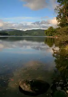 The name of the loch comes from àird, the Scottish Gaelic word for a promontory, headland, height, ultimately from àrd meaning high. The loch is approximately 4 by 2 km (2.5 by 1.2 mi) in size and runs east-west along a sheltered glen. It is sometimes considered to be the source of the River Forth,[3] although the river's true source is the confluence of its outflow, the Avondhu River, and Duchray Water.[4] Loch Ard lies downstream of Loch Chon. The loch contains several small islands including Eilean Gorm, Briedach, St. Mallo, which is rumoured to have an old chapel dedicated to that saint, and Dundochill, which is the site of Duke Murdoch's castle that may have been built by the Duke of Albany.[5] Though one of Scotland's smaller lochs, it is one of the most picturesque and its sheltered location means it is ideal for kayaking and other water sports.