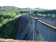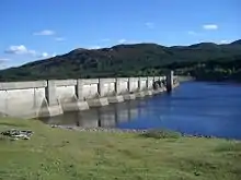 The Errochty dam lies at the head of Glen Errochty, two km NW of the hamlet of Trinafour at the approximate grid reference of NN689654. The loch has an area of 303 hectares[1] and is 5 km long and a kilometre across at its widest point. The loch is entirely man made, being created by the damming of the Errochty Water, the river which runs down the glen. The dam was constructed in 1957 by the contractors A. & M. Carmichael Ltd as part of phase two of the Tummel hydro-electric power scheme. The loch stands at 330 metres above sea level. The dam itself is an example of a diamond-headed buttress dam, it is 49 metres high and 354 metres across. The diamond-headed buttresses provide extra strength to deal with possible tremors from the Highland Boundary Fault which runs just to the south of Pitlochry.[2] Water from Loch Errochty is diverted through a 10 km long tunnel to the Errochty hydroelectricity power station at the western end of Loch Tummel. The gatehouse for the tunnel at Loch Errochty is near the southern shore, the actual intake is beneath it at the bottom of the loch. The power station has a maximum output of 75 MW and is the largest power producer of the nine main stations in the Tummel scheme. Water is released from the dam to compensate the flow of the Errochty Water, this compensation water flows down a pipeline for 1.5 km to the very small 500 kW[3] hydro power station at Trinafour before being released into the Errochty Water.[4]