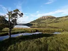 The single name Lochan na h-Earba is applied to two lochs to the south of Loch Laggan in Highland, Scotland, close to the historic boundary between Lochaber and Badenoch. It is thought that the two lochs once formed a single loch, but became separated by the build up alluvial deposits from the Moy Burn (Scottish Gaelic: Allt a' Mhaigh), which now joins the short watercourse that connects the two lochs.[1] Ordnance Survey maps of the area show a single name printed across both lochs. They occupy a narrow glen running southwest to northeast, and roughly parallel with Loch Laggan, from which they are separated by the Binnein Shuas range of hills. The Munros of Geal Charn and Creag Pitridh are the highest peaks of the hills to the southeast.[2]