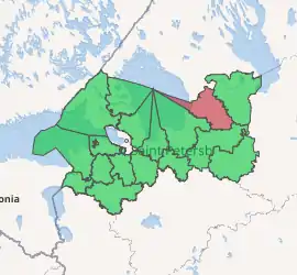 Lodeynopolsky District (Russian: Лодейнопо́льский райо́н) is an administrative[1] and municipal[6] district (raion), one of the seventeen in Leningrad Oblast, Russia. It is located in the northeast of the oblast and borders with Olonetsky District of the Republic of Karelia in the north, Podporozhsky District in the east, Tikhvinsky District in the south, and Volkhovsky District in the west. The area of the district is 4,900 square kilometers (1,900 sq mi).[2] Its administrative center is the town of Lodeynoye Pole.[1] Population (excluding the administrative center): 9,795 (2010 Census);[3] 12,185 (2002 Census);[8] 13,426 (1989 Census).[9]