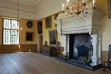 The entrance hall contains two original arches. One of these includes a fireplace, the other leads to the staircase. The National Trust has inserted a panelled wall on the left.[16] The staircase has been rebuilt by the National Trust in a stairwell measuring 18 feet (5 m) by 18 feet (5 m), and its oak balusters have been copied from those at Cornbury Park in Oxfordshire.[17]